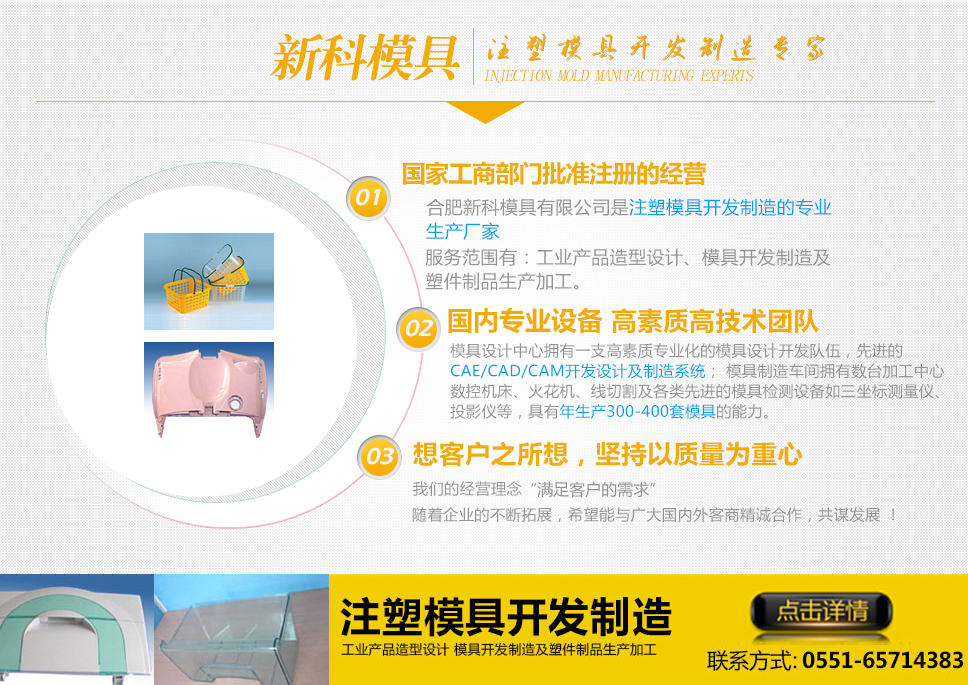 合肥新科模具有限公司 公司简介 合肥新科模具有限公司   合肥新科模具有限公司是注塑模具开发制造的专业生产厂家,其服务范围有:工业产品造型设计、模具开发制造及塑件制品生产加工。长期以来新科人本着诚信互利的精神,不断开拓创新以优质快捷和良好的售后服务,赢得众多客户的信赖与好评,并保持着长期友好的合作关系。模具设计中心拥有一支高素质专业化的模具设计开发队伍,先进的CAE/CAD/CAM开发设计及制造系统; 模具制造车间拥有数台加工中心、数控机床、火花机、线切割及各类先进的模具检测设备如三坐标测量仪、投影仪等,具有年生产300-400套模具的能力。经验丰富的模具开发队伍在模具开发前期就对所开发产品进行优化,确保在满足客户要求的前提下让开发产品更符合模具开发的理念,为制造优良的模具做好了前期充份的准备,并融入一切为了客户的模具开发理念,尽...